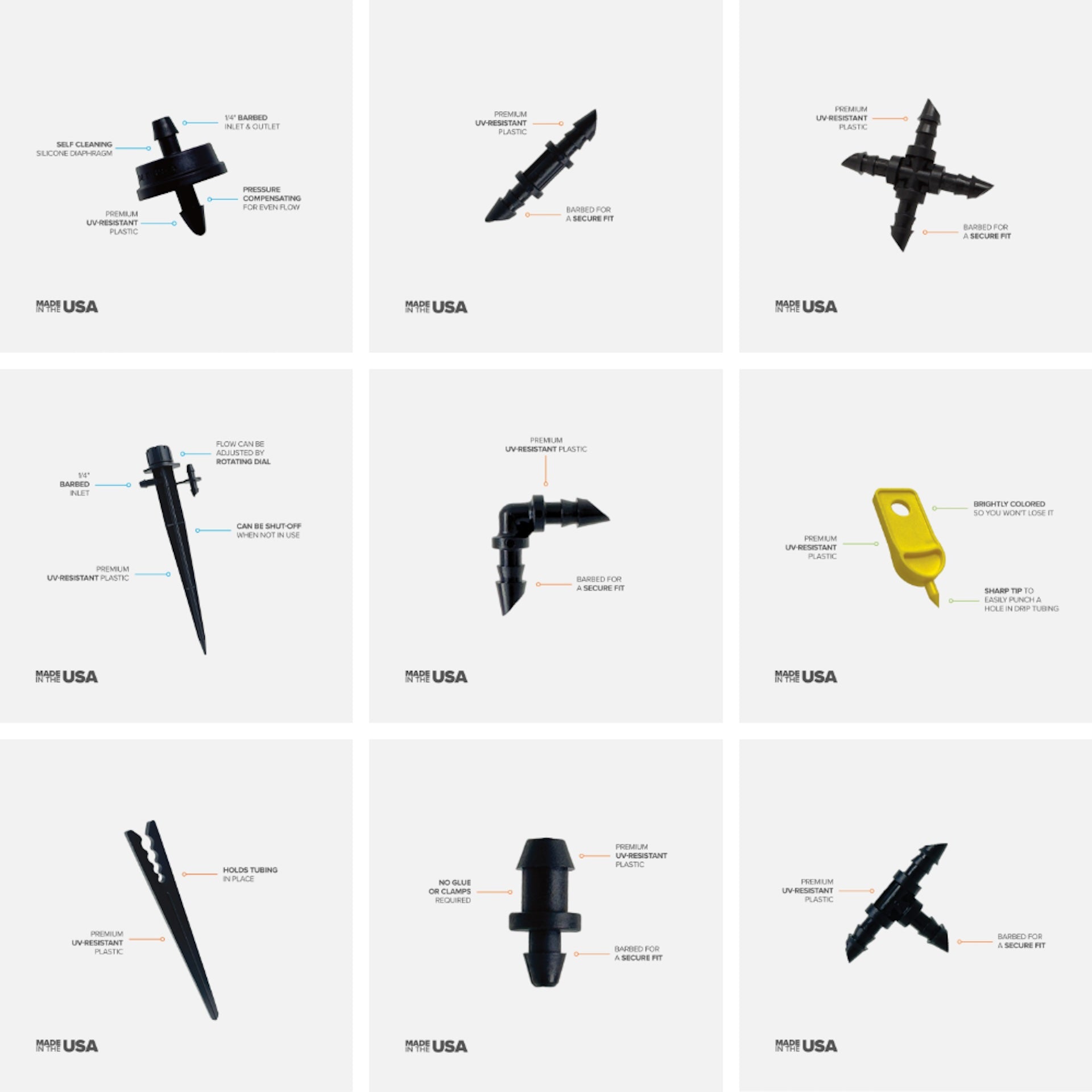 This assortment includes commonly used fittings, emitters & tubing to repair or extend your 1/4" dripper lines. An essential, cost effective kit for pots, beds, gardens and hanging baskets.